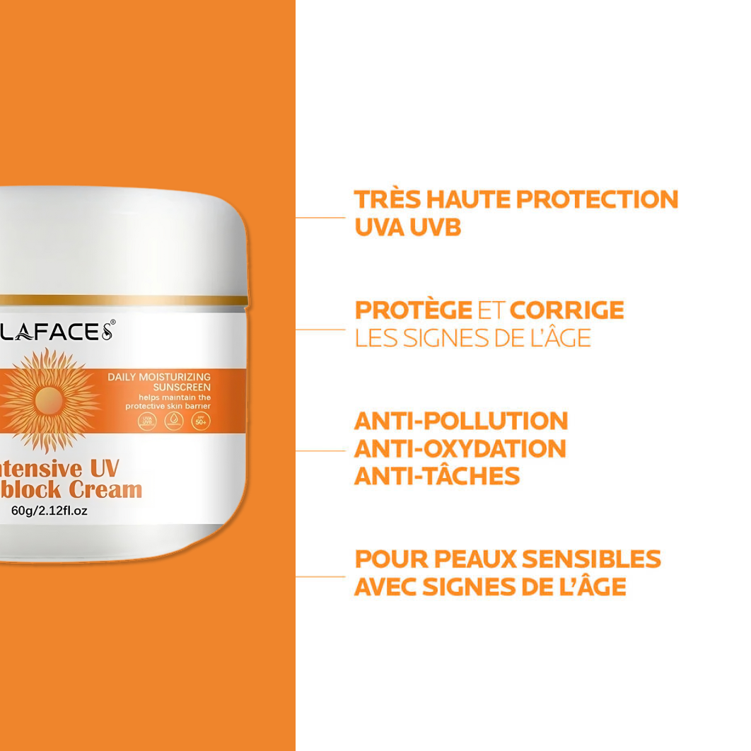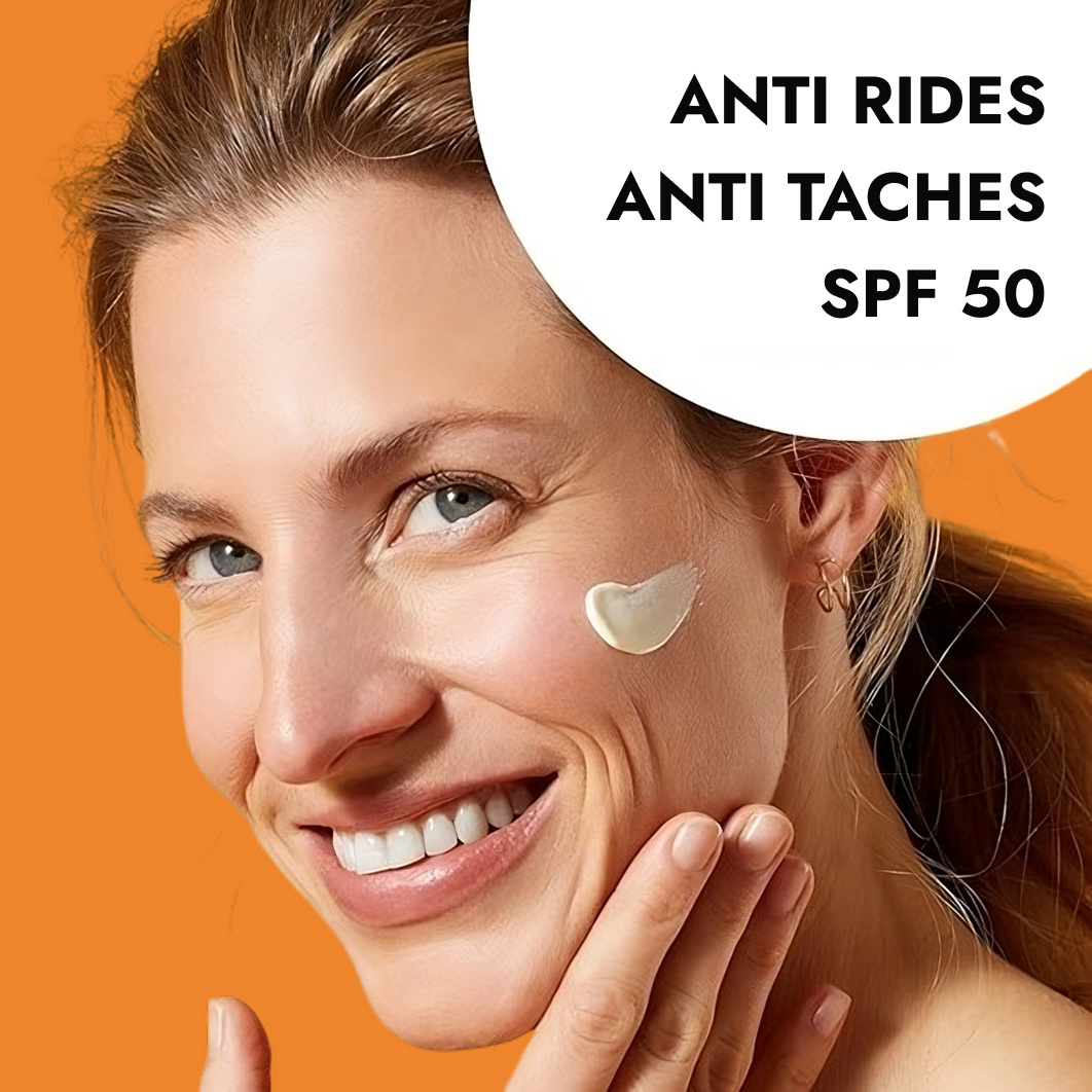 La Crème Solaire et Hydratante Anti-âge SPF 50+ protège immédiatement des rayons UVA/UVB, hydrate la peau du visage et prévient les signes de vieillissement cutané grâce au Q10. 🧡